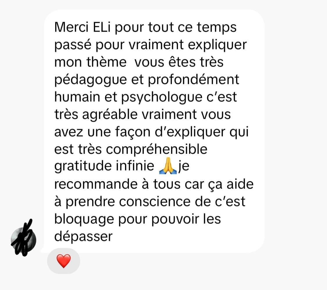 Tu bénéficies d'un accompagnement privilégié en individuel directement avec moi, pour pouvoir t'accompagner dans tes interrogations et exercices pratiques, tout au long du processus.