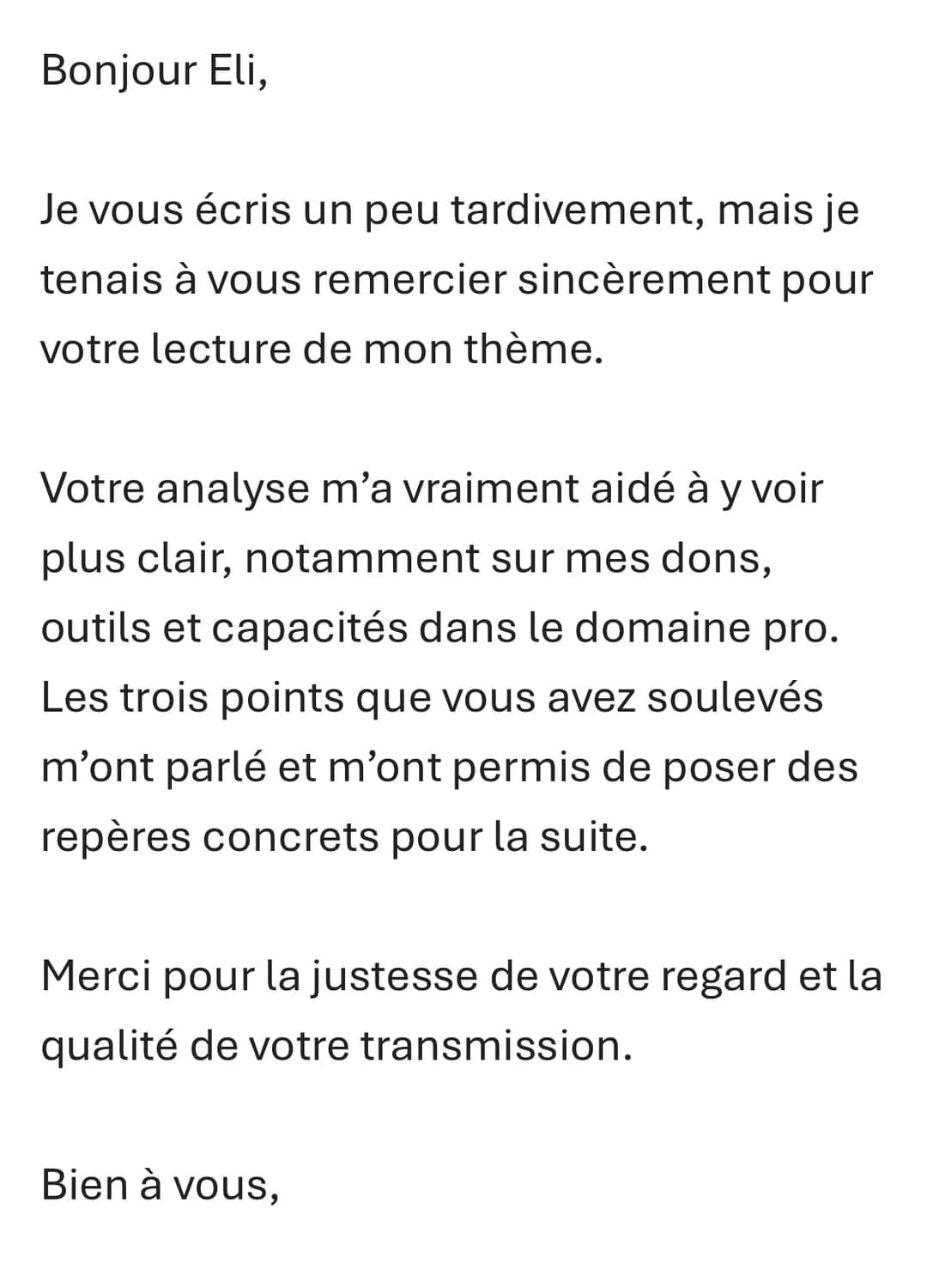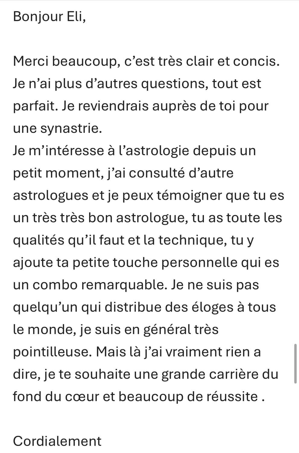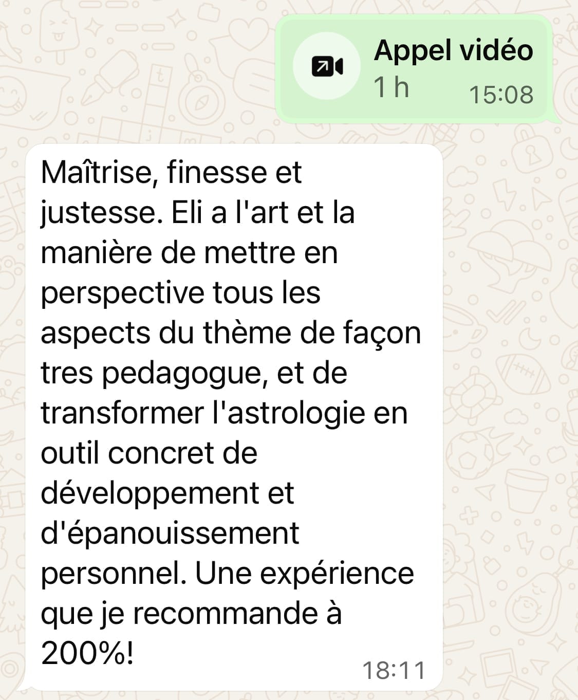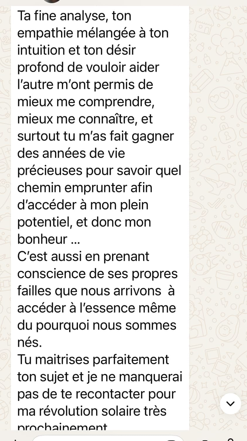 Prudent quant au jargon astrologique traditionnel, trop fataliste ou encore à certaines explications "mainstream" sensationnalistes et peu mobilisables concrètement, j'ai aiguisé mon regard sur cette discipline, et accompagné de nombreuses personnes, qui ont pu se comprendre, prendre leur place et développer leur potentiel. (Tu trouveras d'ailleurs, certains de leurs témoignages plus bas sur cette page)